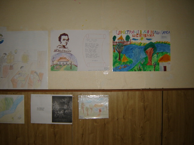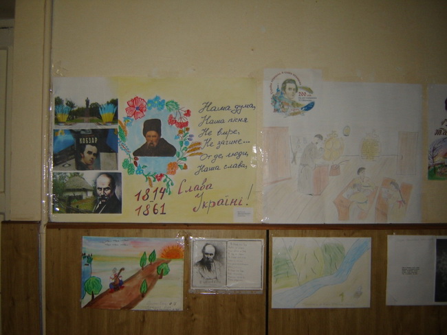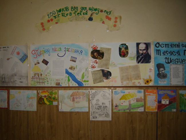 експозиція стіннівок, підготованих учнями школи , присвячених ювілею Кобзаря «200 років з Дня народження Т.Г. Шевченка»,