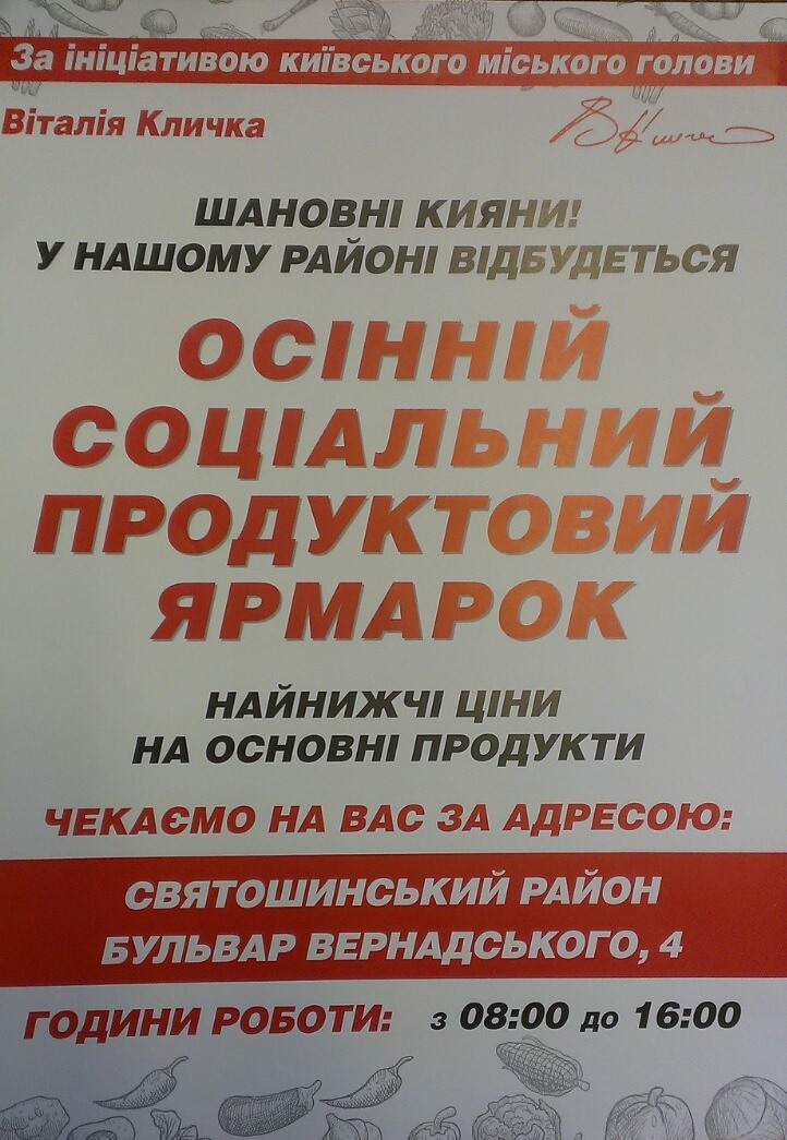 За ініціативи Київського міського голови Віталія Кличка 29 жовтня 2016 року у Святошинському районі відбудеться соціальний продуктовий