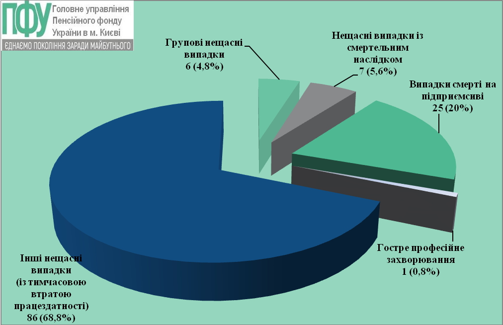 За I квартал 2023 року до Головного управління Пенсійного фонду України в м. Києві (далі – Головне управління) надійшло 133 повідомлення про нещасні випадки, внаслідок яких постраждали 148 осіб, в т. ч. 40 осіб – із смертельним наслідком. Із загальної кількості повідомлень, які надійшли у I кварталі 2023 року, 8 про випадки, що сталися у попередній рік.