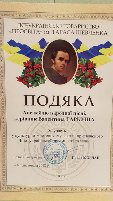 Юні виконавці заспівали Віночок українських народних пісень, який слухачі зустрічали бурхливими оплесками. За участь у культурно-мистецькому заході Ансамбль був відзначений Подякою Всеукраїнського Товариства «Просвіта» ім. Тараса Шевченка.