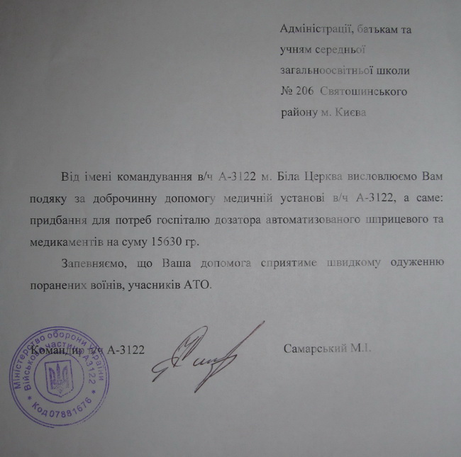 В останні хвилини зустрічі директор школи, учителі, батьківський комітет школи тепло подякували воїнам-патріотам, побажали кожному здоров’я, надії і віри на краще. Командир в/ч А-3122 Самарський М.І. прийняв з рук святошинських школярів медичне устаткування та ліки, щиро подякував за підтримку і допомогу та запевнив, що й надалі хлопці мужньо захищатимуть Україну, її територіальну цілісність та недоторканість. А далі було фото на згадку...