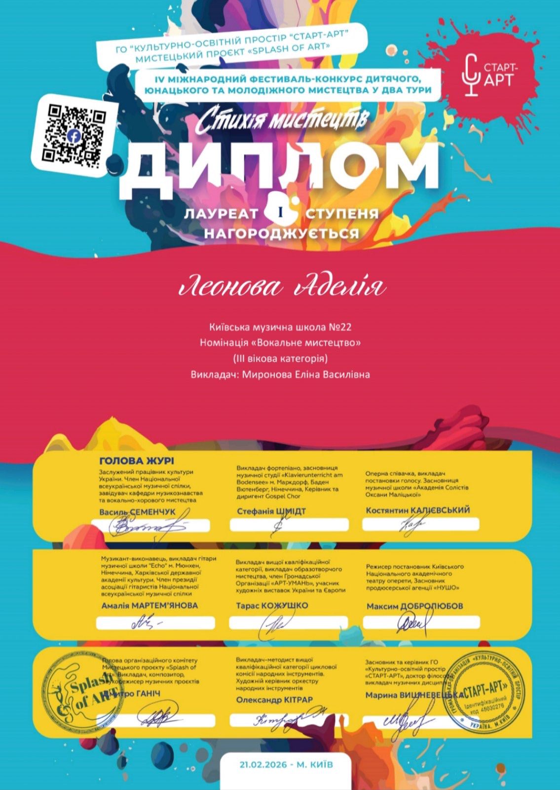 Учениця Київської дитячої музичної школи № 22 Аделія Миронова, вихованка талановитої викладачки з естрадного вокалу Еліни Миронової, яскраво заявила про себе на IV Міжнародному фестивалі-конкурсі дитячого, юнацького та молодіжного мистецтва у два тури «Стихія мистецтв» (мистецький проєкт Splash of Art від ГО «Культурно-освітній простір «Старт-Арт»).