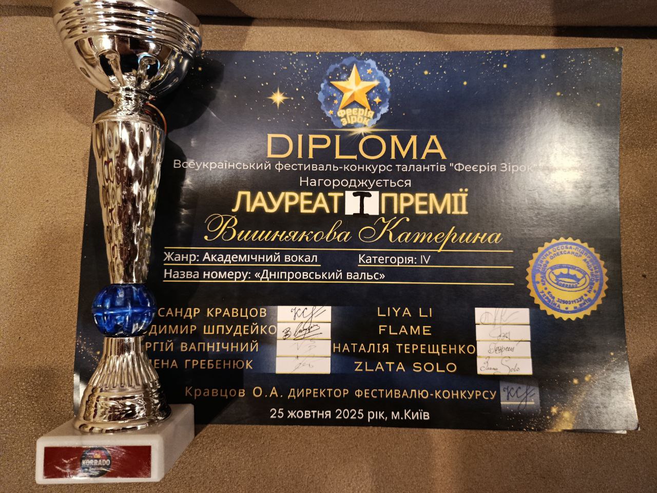 Днями учениця вокально-хорового відділу Київської дитячої музичної школи № 23 Катерина Вишнякова (викладач Тетяна Стефанишина) виборола чергову блискучу перемогу, взявши участь у Всеукраїнському фестивалі-конкурсі талантів «Феєрія зірок». Емоційно та натхненно виконавши «Дніпровський вальс» Ігоря Шамо, на слова Валерія Курінського, Катерина не залишила байдужими жодного з членів поважного журі, які одностайно присудили юній виконавиці найвищі бали. Катерина стала лауреатом І премії в номінації «Академічний вокал» в IV категорії. А також, як бонус за успішний виступ, з нею провела індивідуальний майстер-клас член журі конкурсу, оперна співачка Олена Гребенюк.