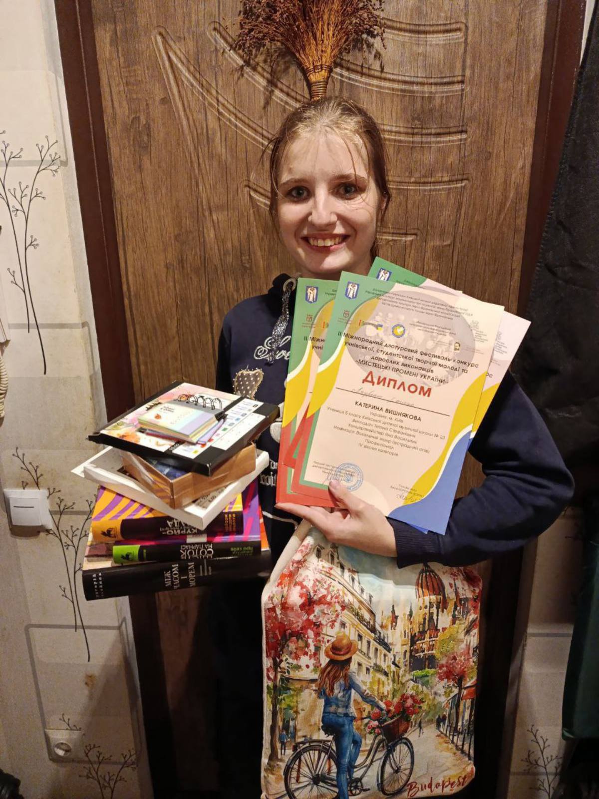 Для розгляду журі Катерина представила у своєму виконанні твори у номінації: «Вокальний жанр (академічний спів)», «Ой три шляхи широкії» Якова Степового на слова Тараса Шевченка та «Весняний вітер» Богдани Фільц на слова Олександра Олеся. Юна вокаліста, яка змагалась з досить дорослими конкурсантами – професіоналами, створила неймовірну феєрію, де музика і спів сплелися в єдину симфонію нашої культури, і отримала найвищі бали вибагливого високопрофесійного журі. І як результат - ГРАН-ПРІ!