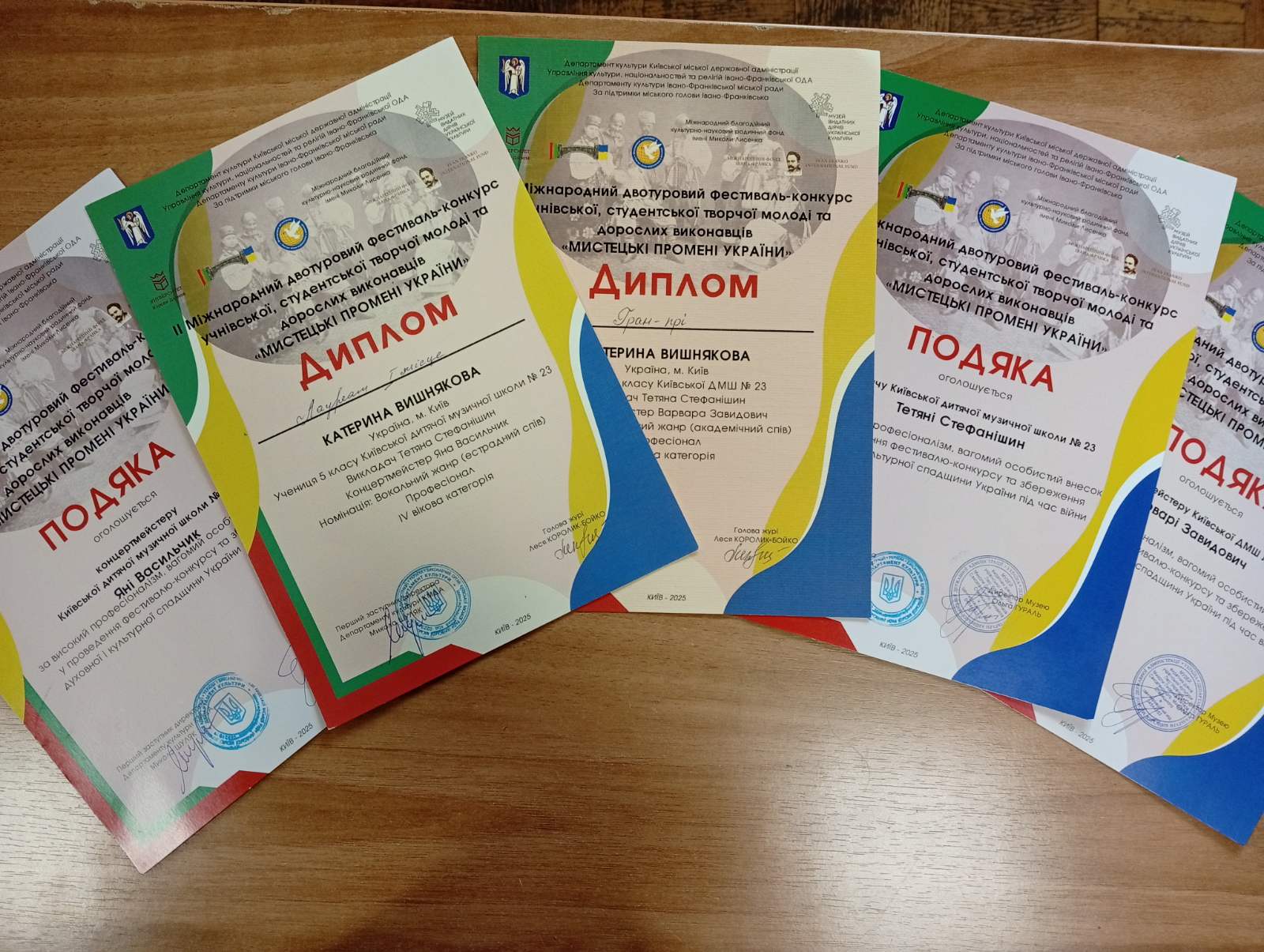 Учениця Київської дитячої музичної школи № 23 Катерина Вишнякова (викладач Тетяна Стефанишина, концертмейстери Яніна Васильчик та Варвара Завидович) виборола блискучу перемогу та стала учасницею Гала-концерту ІІ Міжнародного фестивалю-конкурсу “Мистецькі промені України”.