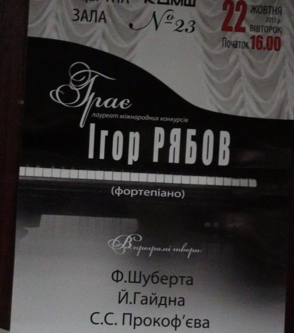 22 жовтня 2013 року концертна зала Київської дитячої музичної школи №23 управління культури, туризму та охорони культурної спадщини Святошинської районної в місті Києві державної адміністрації в цьогорічному сезоні «Музичної вітальні» зустрічала з новою концертною програмою багаторазового лауреата Міжнародних конкурсів, викладача Київської середньої спеціальної музичної школи імені Миколи Лисенка Ігоря Рябова.
