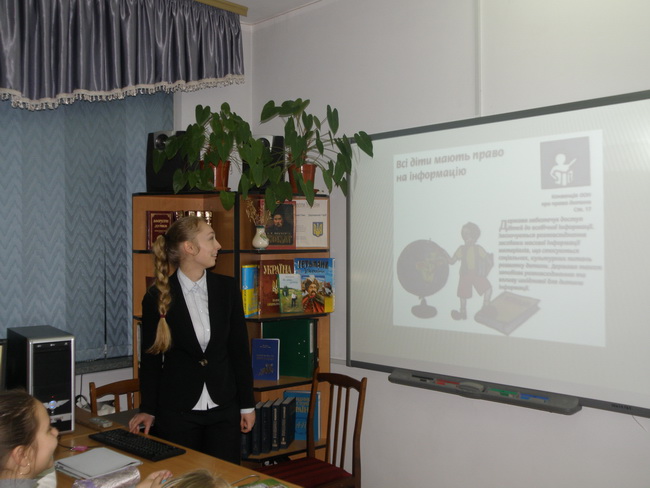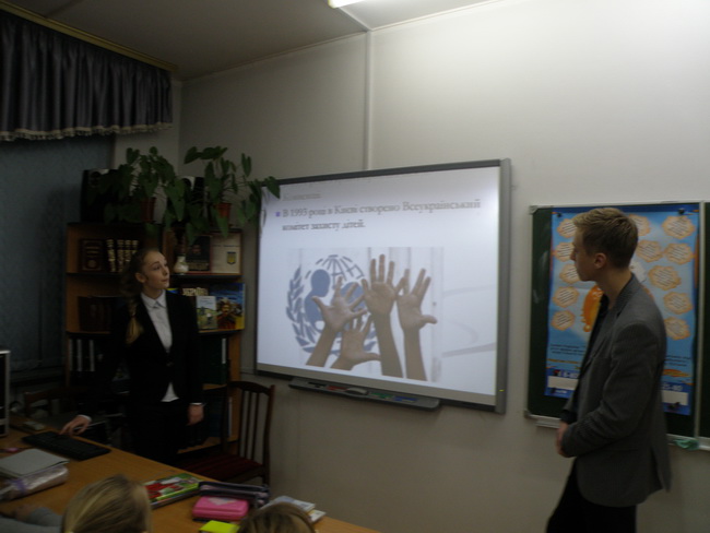 Розгляду основних питань, які висвітлюються у Конвенції про права дитини і було присвячено виступ лідерів учнівського самоврядування та старшокласників спеціалізованої школи № 304 Кулівник Христини та Блінова Микити перед учнями шостих та сьомих класів.