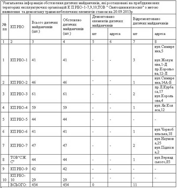 Як повідомив директор ТОВ «Святошинжитлосвіт» П.Ковальчук, працівники підприємства провели обстеження дитячих майданчиків, розташованих на прибудинкових територіях експлуатуючих організацій КП «РЕО 1-7,9,10», з метою виявлення та демонтажу травмонебезпечних елементів, станом на 20.09.2013 року.