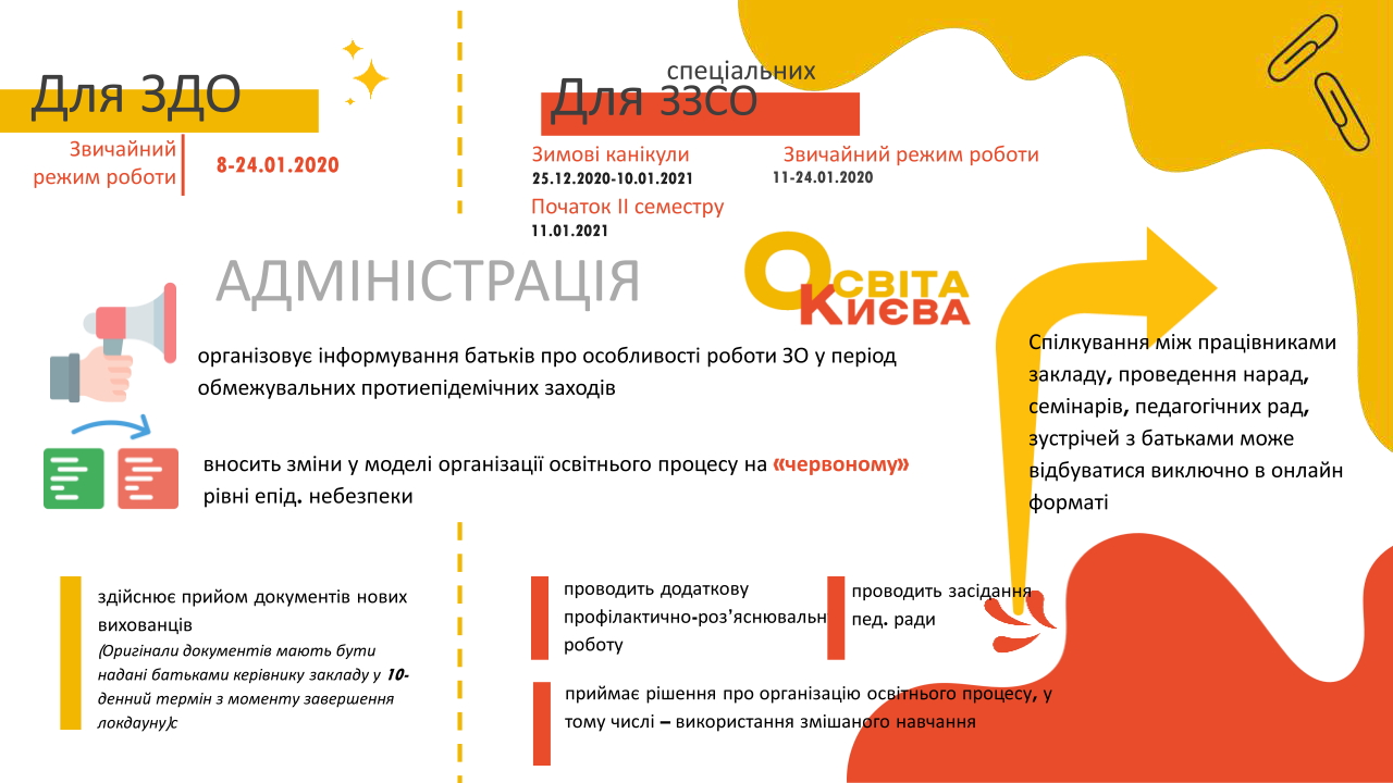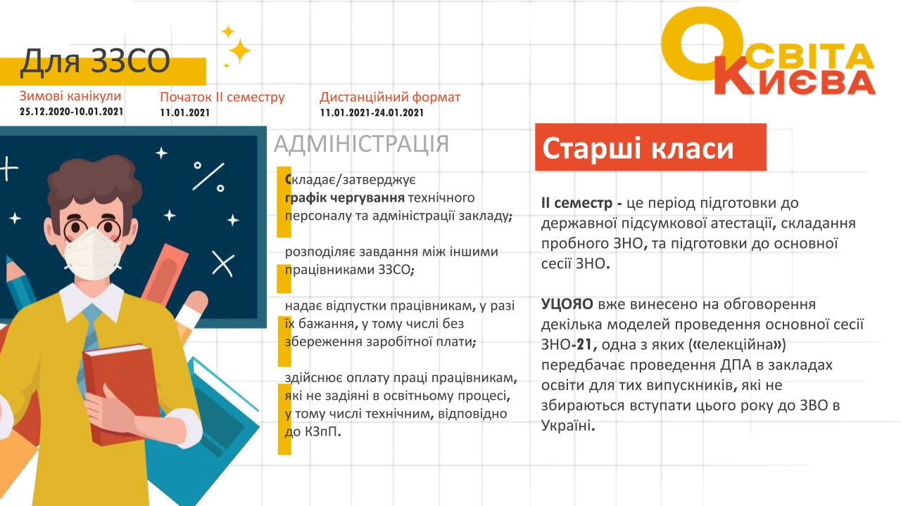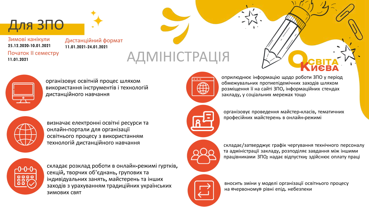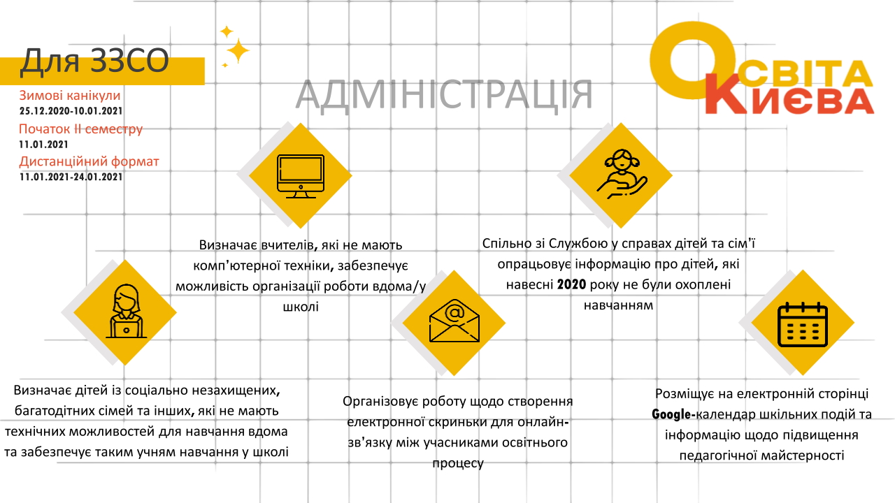 «За результатами опитування керівників шкіл Києва, понад 80% бажають працювати за чіткими зрозумілими правилами. Тому ми підготували поради та рекомендації для всіх типів закладів: загальної середньої, позашкільної, професійної (професійно-технічної) освіти. Для підвищення професійної майстерності педагогів заплановано майстер-класи, семінари, тренінги в онлайн-форматі. На допомогу керівникам освітніх установ буде надано Google-календар подій. Тут для себе знайдуть цікаву інформацію всі учасники освітнього процесу. Психологи надаватимуть свої рекомендації: як створити святковий комфортний настрій у період, коли сім’я залишається вдома в замкненому просторі та багато інших професійних цікавих рекомендацій», – сказала директорка Департаменту Олена Фіданян.