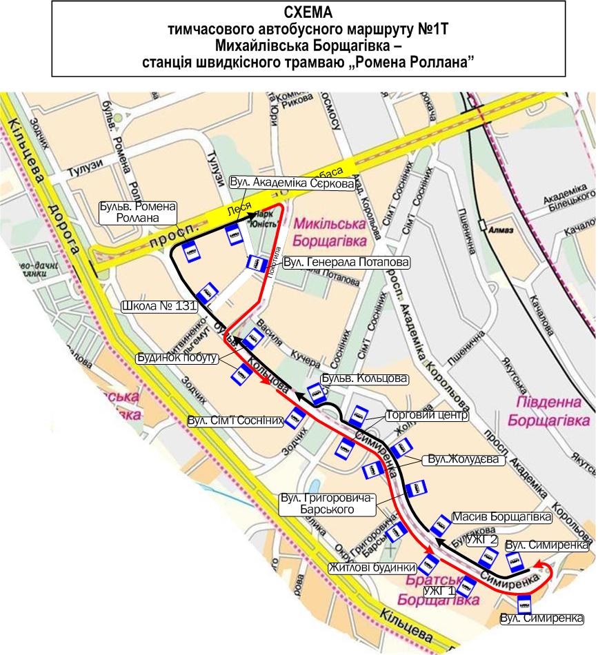 Для забезпечення належного стану пасажирських перевезень на вказаний період збільшується кількість автобусів на автобусних маршрутах № 9 «вул.Булгакова – ст.м. «Лук’янівська» та № 23 «вул.Симиренка – вул.Салютна», а також організовується робота тимчасового автобусного маршруту № 1Т «Михайлівська Борщагівка – станція швидкісного трамвая «Ромена Роллана», за трасою: вул. Симиренка – бульв. Кольцова – просп. Леся Курбаса – вул. Володимира Покотила – бульв. Кольцова – вул. Симиренка, з правом проїзду по місячних проїзних квитках, придбаних для проїзду в трамваї.