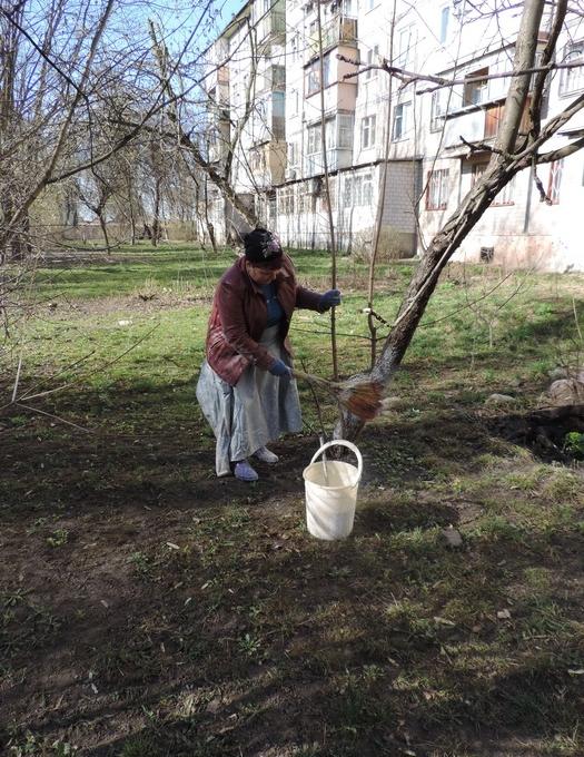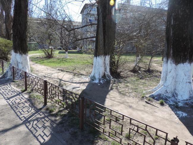 Ще одна важлива умова: побілкою дерев потрібно займатися тоді, коли погода суха, але ще не тепла, саме тому працівники КП «РЕО-3» провели весняу побілку дерев на газонах прибудинкових територій по вулиці Картвелішвілі, 9-А 29 березня 2014 року.