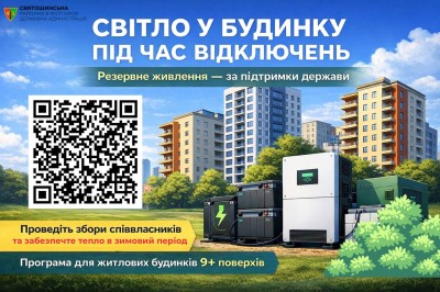 У Святошинському районі стартує можливість для багатоквартирних будинків долучитися до програми встановлення систем резервного живлення. Це про базові речі — воду, тепло та роботу ліфтів у будинку навіть під час відключень.