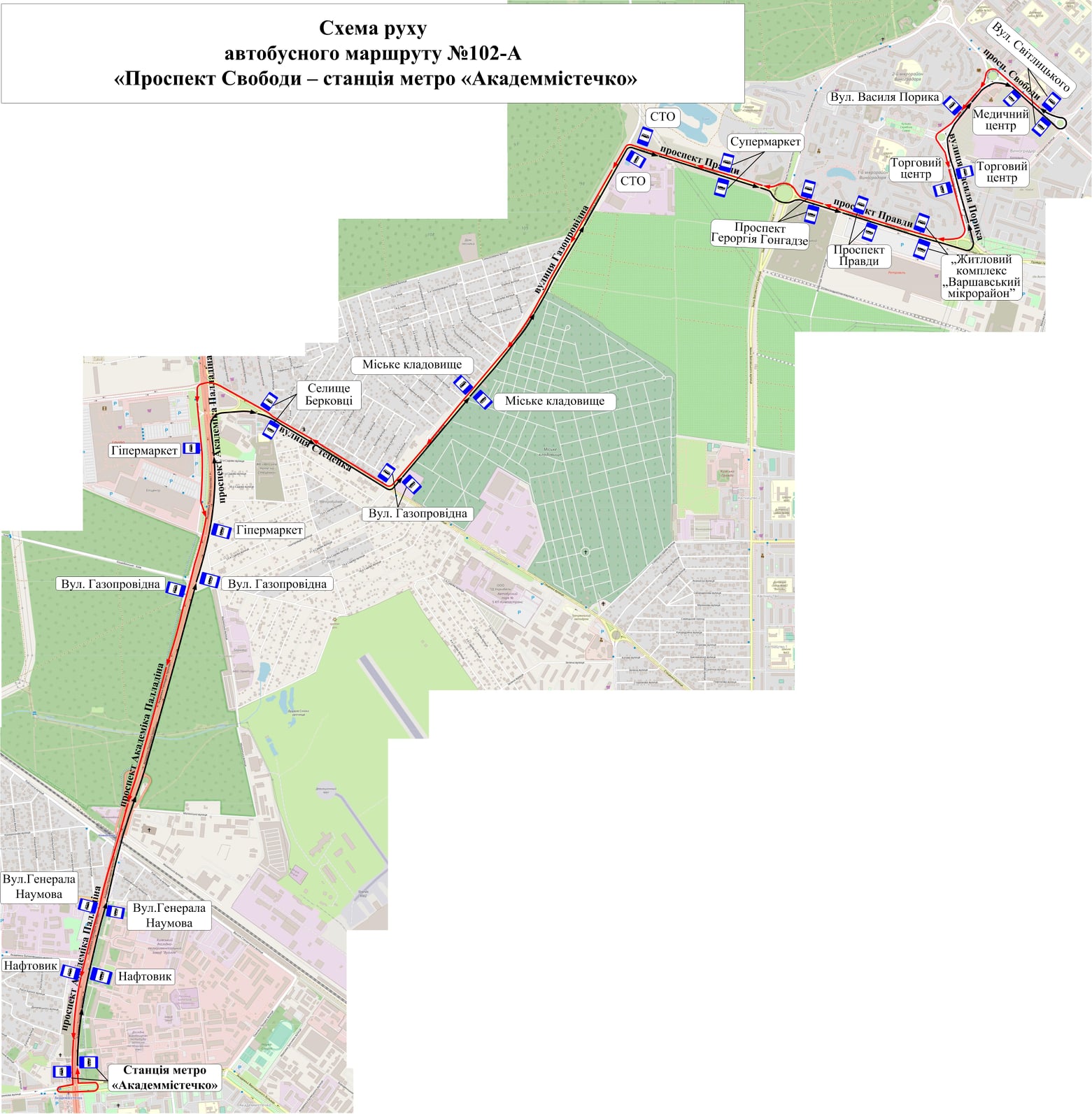 Автобус № 102-А рухатиметься за схемою: просп. Свободи (від вул. Світлицького) – просп. Василя Порика – просп. Правди – вул. Газопровідна – вул. Стеценка – вул. Берковецька – просп. Академіка Палладіна – ст. м. «Академмістечко».