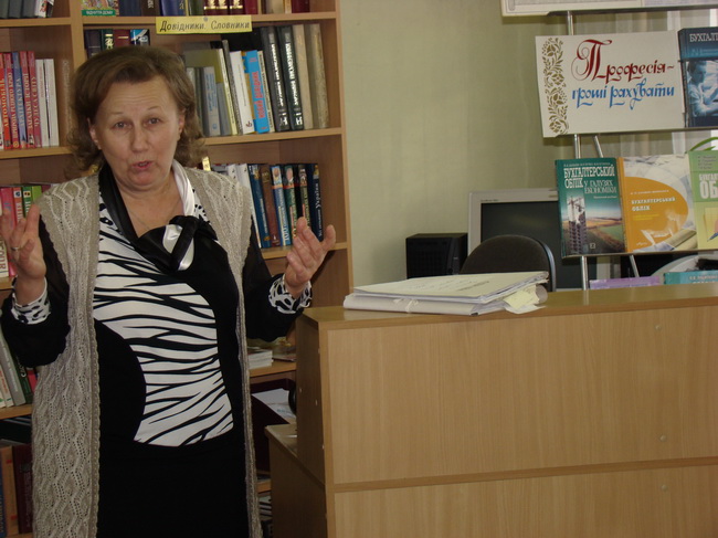 В рамках роботи клубу 18 лютого 2014 року у бібліотеці пройшла чергова зустріч, яка дала змогу учасникам - учням 9-х та 11-х класів загальноосвітнього навчального закладу №40 ознайомитись з професією бухгалтера. Бібліотекар І категорії Максименко Олена Григорівна розповіла присутнім про історію походження однієї з найдавніших і найпоширеніших професій, перші витоки якої йдуть в глиб тисячоліть; розповіла присутнім про значення бухгалтерського обліку в системі економіки та зробила огляд навчальних закладів, які готують спеціалістів вказаного напрямку.