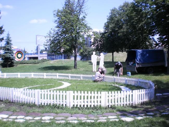 Квітневими днями працівники зеленого господарства Святошинського району за власні кошти підприємства створили в парку «Юність» об’ємно-просторову композицію «Молодята».