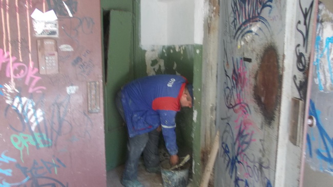 На звернення мешканців житлового будинку № 23-а по вулиці Генерала Наумова малярами КП «РЕО – 7» було проведено косметичний ремонт вхідної групи під’їзду №2 та розпочато ремонтні роботи у під’їзді №1 вказаного будинку.