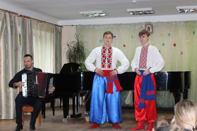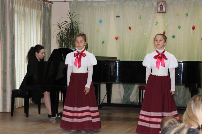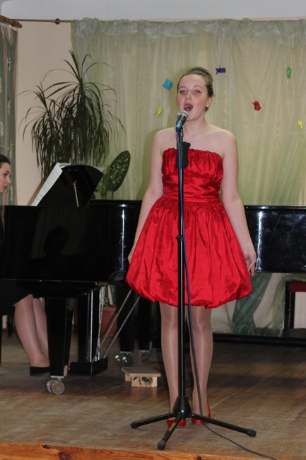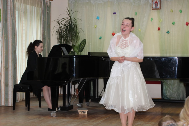 Учні викладача Стефанишиної Тетяни Володимирівни у супроводі Шаріної Анастасії Вадимівни привітали гостей зали творами: Ллойд Веббер «Pie Jesu» - дует «Сестер Наруцьких», І. Люцци «Ave Maria» - Ірина Кравченко, Василь Барвінський на слова Лесі Українки «Знов весна» – Власенко Ангеліна, Дждордж Гершщвін «Колискова Клари» - Дар’я Максимчук.
