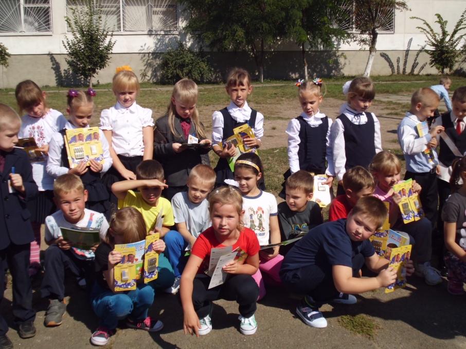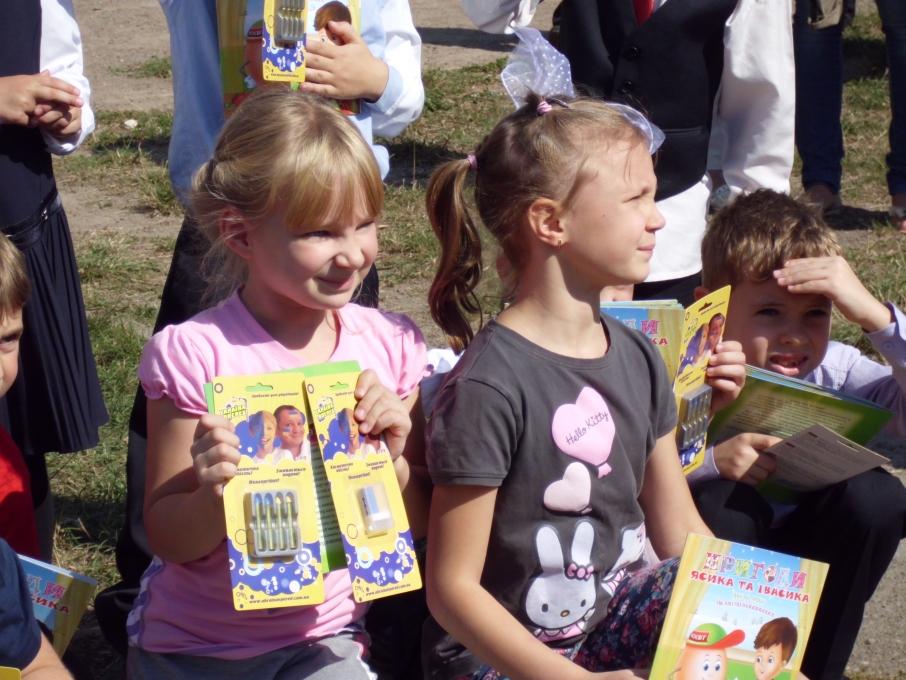 Всі першокласники отримали чудові призи від спонсорів – яскраві книжечки та набор для нанесення національної символіки вболівальникам.