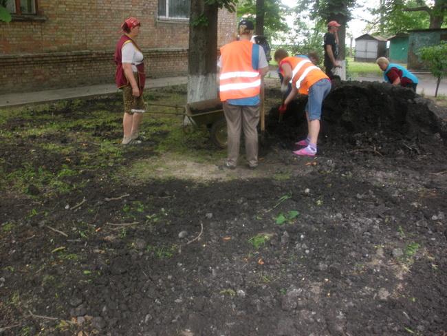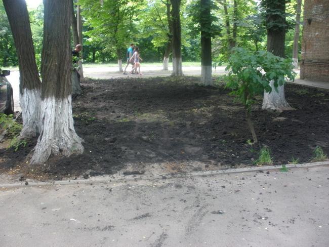 Комунальники розвезли чорнозем на прикореневу систему дерев та висіяли на газони траву, створили біля будинку новий квітник та вивезли з прибудинкової території великогабаритне сміття.