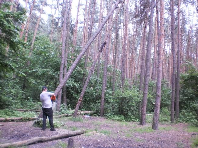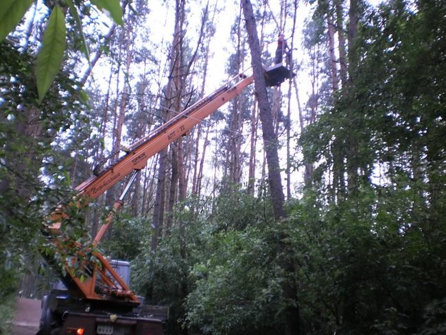 Для зняття завислих дерев та видалення зламаного верхів’я працьовиті озеленювачі використовували телескопічну вишку, а лежачі дерева розпилювали вручну і при цьому проводили складування деревини та гілля.