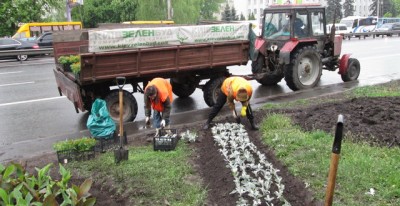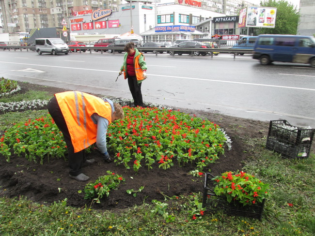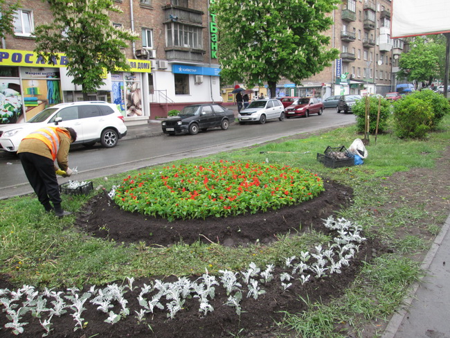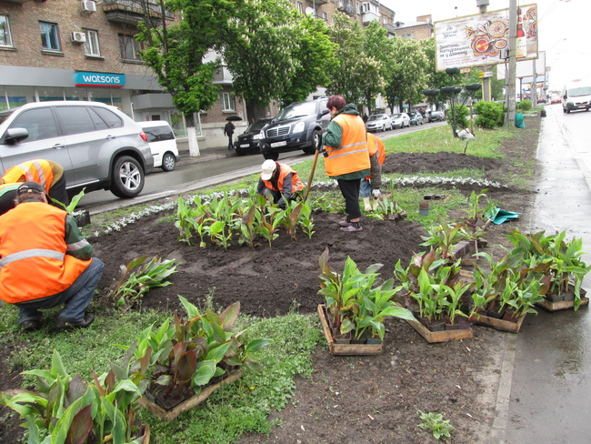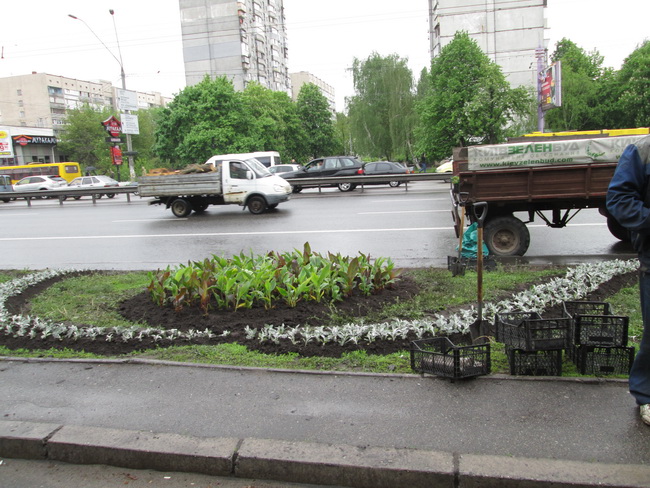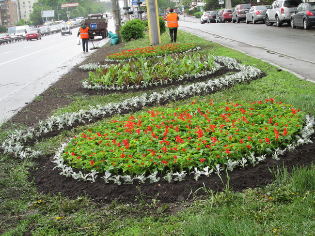 На проспекті Перемоги, де проходять сотні людей та проїжджають тисячі машин, невтомні працівники зеленого господарства не просто висаджують квіти, а створюють різні квіткові композиції та візерунки, щоб центральна магістраль радувала всіх своїм естетичним виглядом.