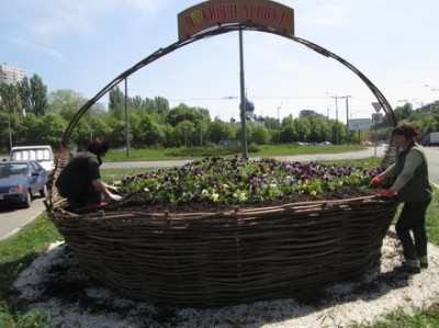 На транспортній розв’язці між бульваром Ромена Роллана та вулицею Якуба Коласа озеленювачі дільниці № 2 комунального підприємства по утриманню зелених насаджень Святошинського району вчорашньою дниною прикрасили віолою квіткову інсталяцію - кошик.