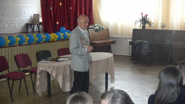 Наш почесний гість – ветеран Великої Вітчизняної війни Зан Михайло Олександрович зустрівся з учнями 7-8 класів, і діти дуже уважно слухали кожне слово з цікавих розповідей про бойові будні воїнів – ветеранів. Здавалося, кожен з юних сам побував у вирі війни. Учні щиро дякували сивому ветерану, мужньому герою.