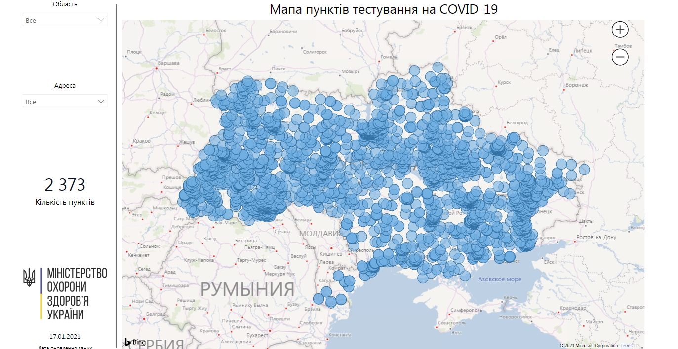 Мапа пунктів забору біологічного матеріалу для проведення лабораторних досліджень на гостру респіраторну хворобу СОVID-19