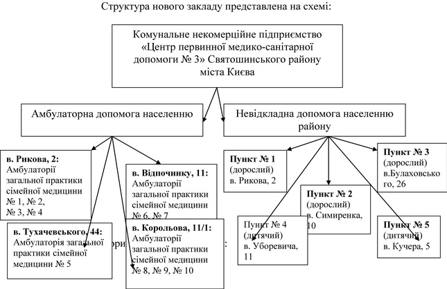 На виконання даного Закону України рішенням ХІ сесії VI скликання Київської міської Ради від 22.05.2013 року № 334/9391 поліклініка № 2 Святошинського району міста Києва (вул. Рикова, 2) була реорганізована в комунальне некомерційне підприємство «Центр первинної медико-санітарної допомоги № 3» Святошинського району міста Києва (вул. Рикова, 2).