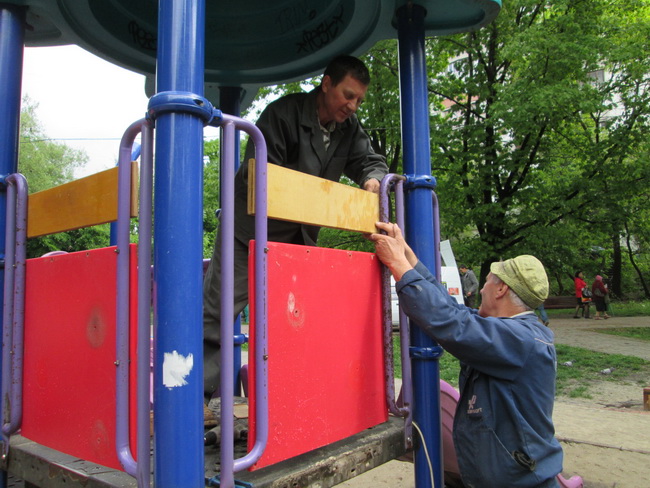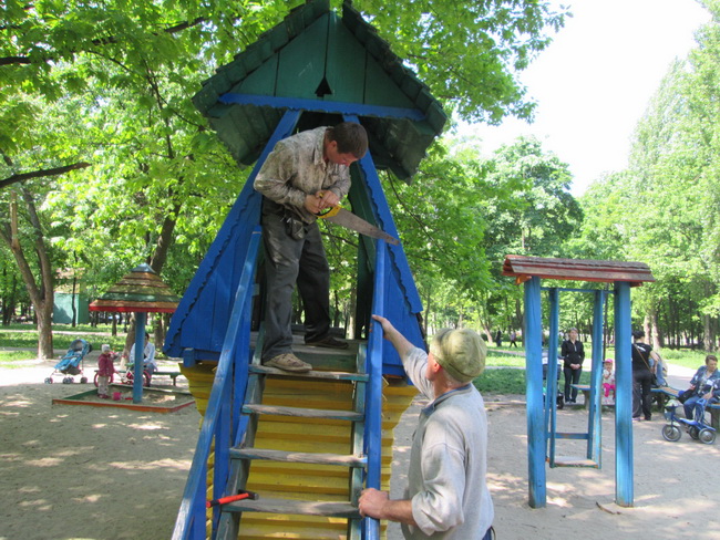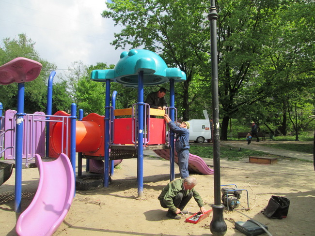 Відповідальні працівники зеленого господарства постійно слідкують не тільки за станом зелених насаджень, а й обстежують дитячі майданчики, які знаходяться на балансі підприємства, та піклуються про безпечний та зручний відпочинок малечі.