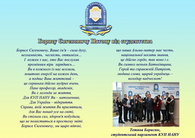Напередодні Дня науки ректор, професор Юрій Бошицький та делегація студентів мали зустріч з президентом Національної академії наук України, академіком Борисом Патоном. У рамках зустрічі ректор проінформував Бориса Патона щодо інноваційних форм у навчально-виховному процесі, про наукову діяльність професорсько-викладацького складу. Особливої зацікавленості мала інформація щодо видання юридичного науково-теоретичного щоквартального збірника праць науковців «Часопис Київського університету права». Було представлено світлини нового Міжнародного центру правових та історико-політичних досліджень країн Центрально-Східної Європи КУП НАНУ у м. Львові. Основними завданнями Центру є:сприяння гармонізації українського законодавства із європейським правовим полем у суспільно-політичній, економічній, культурно-просвітницькій, освітньо-науковій та інших сферах суспільного життя; формування національно-патріотичного світогляду серед широких верств населення і національної еліти як Львівщини, так і України загалом; реалізація суспільних ініціатив шляхом взаємодії з центральними і місцевими органами влади. Право вибороти до складу делегації виборювали студенти, випускники університету, взявши участь у конкурсі написання поезії на честь Бориса Патона – науковця із світовим ім`ям. Зустріч пройшла у теплій, щирій атмосфері, студенти були глибоко зворушені цією історичною зустріччю, привітали із травневими святами, подарувавши квіти вдячності за увагу до КУП НАНУ, продекламували поезію та запросили на традиційні заходи університету.