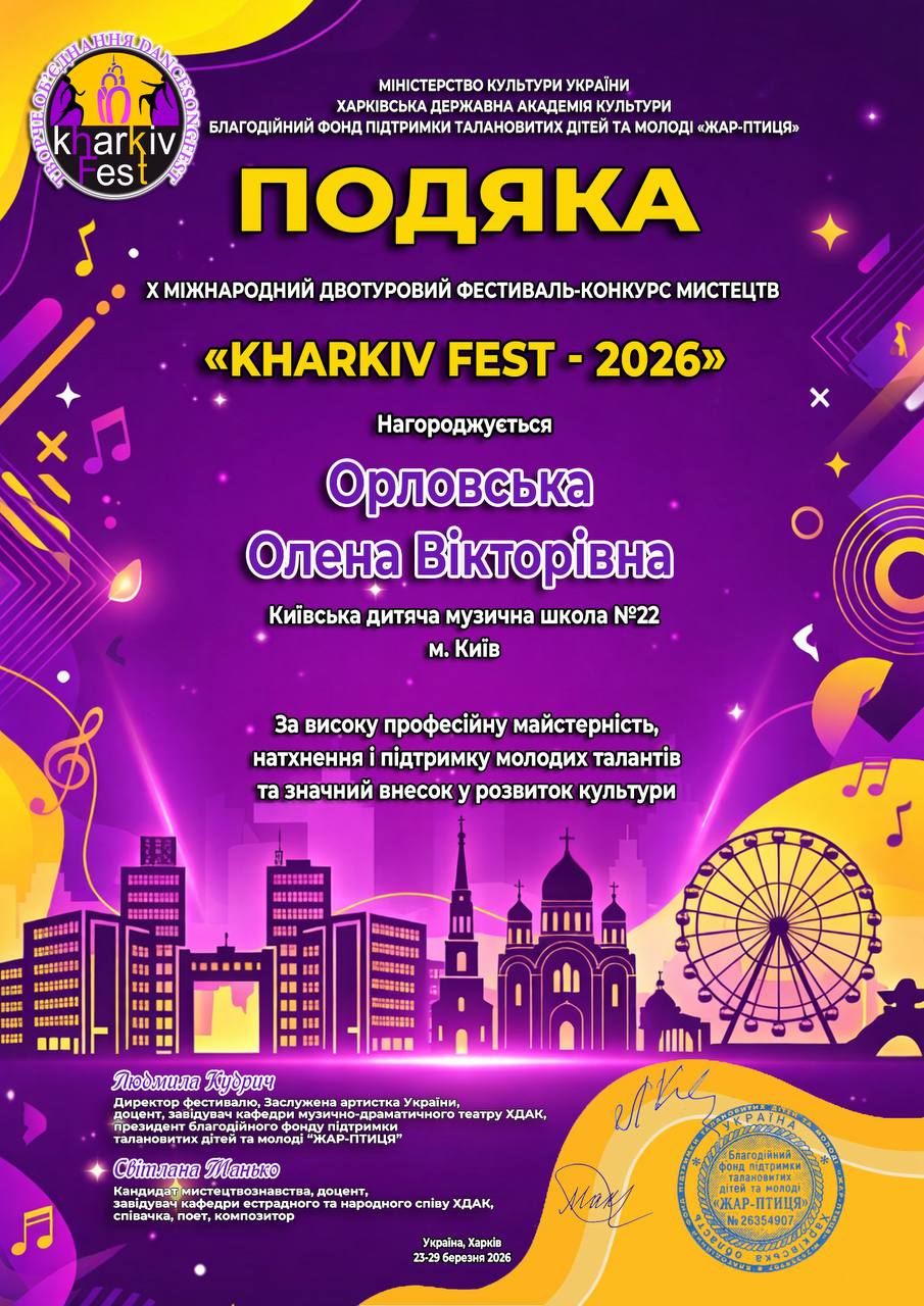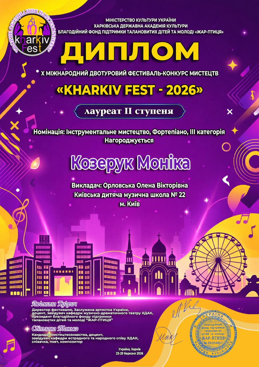 На X Міжнародному двотуровому фестивалі-конкурсі мистецтв «Kharkiv Fest – 2026» юна піаністка виборола звання лауреата ІІ ступеня у номінації «Інструментальне мистецтво. Фортепіано». Це не просто перемога — це підтвердження глибокого музичного мислення, витонченого відчуття стилю та справжньої любові до музики.