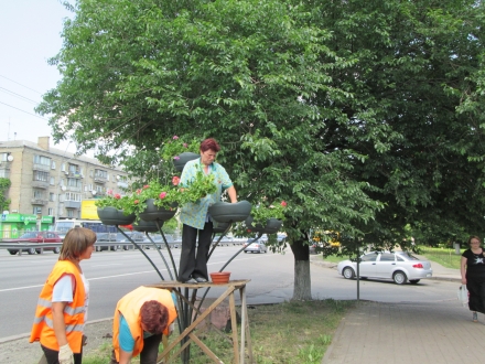 Святошинські працівники зеленого господарства вчорашньою дниною висадили у термочаші на вертикальних конструкціях, які розміщені на газонах центральної магістралі, 360 штук неповторних сурфіній та пеларгоній.
