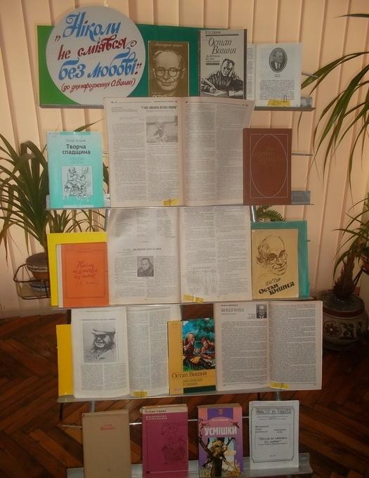 Цікаво та змістовно пройшов театралізований літературний портрет Остапа Вишні у бібліотеці ім. Н.Рибака для юнацтва, активну участь у якому взяли учні 7-а класу Спеціалізованої школи № 40. Бібліотекар І категорії Максименко Олена Григорівна ознайомила присутніх з біографією письменника - гумориста, розповіла про жанрову особливість його творчої діяльності, під гостре перо якої потрапляли підлабузники, хабарники, п’яниці, винищувачі природи та негативні суспільні явища. Присутні дізнались, що найкращі гуморески та усмішки Остапа Вишні перекладені багатьма мовами, а сам письменник перекладав українською мовою твори М. Гоголя, А.Чехова, М.Твена, Я.Гашека.