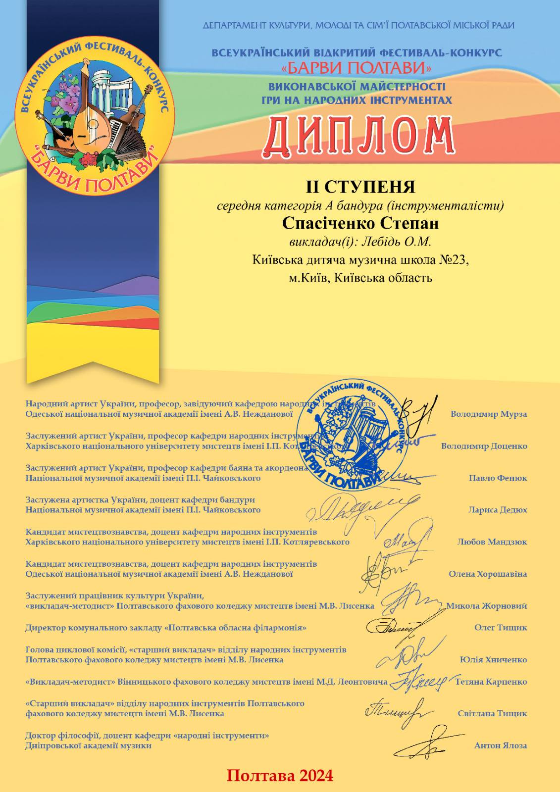 У Всеукраїнському відкритому фестивалі-конкурсі «Барви Полтави» виконавської майстерності гри на народних інструментах учнів та викладачів мистецьких шкіл, який відбувся в місті Полтава за підтримки Департаменту культури, молоді та сім’ї Полтавської міської ради, Полтавської дитячої музичної школи № 2 ім. В.П. Шаповаленка, Степан був нагороджений дипломом лауреата ІІ ступеня.