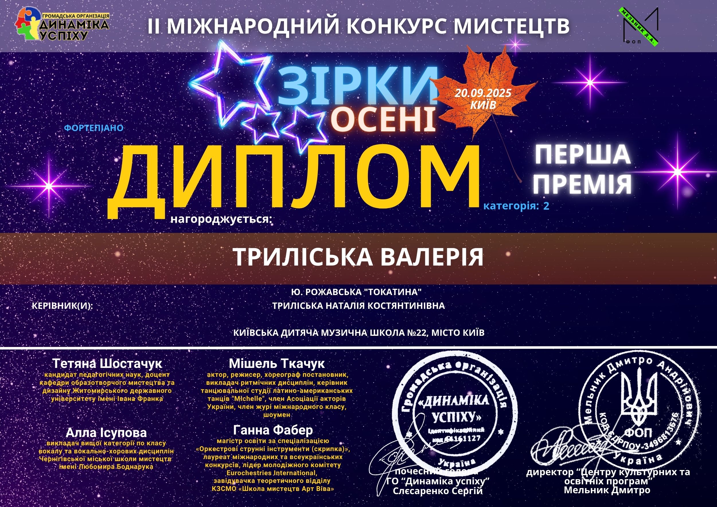 Щирі вітання нашій талановитій Валерії та її наставниці! Нехай ця перемога стане ще одним кроком до великих звершень, а осінь – часом нових творчих відкриттів і натхнення!
