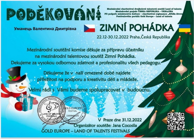Напередодні новорічних свят юні учні Київської дитячої музичної школи № 22 взяли участь у Міжнародному багатожанровому двотуровому благодійному конкурсі мистецтв «Zimni pohadka» («Зимова казка»).