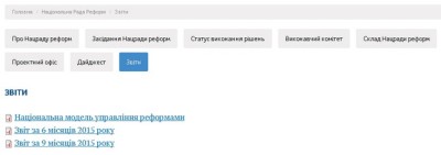 Спеціалісти Проектного офісу Національної ради реформ підготували Звіт «Моніторинг прогресу реформ». Він включає детальний аналіз прогресу виконання планів на 2015 рік відповідальними за кожну з пріоритетних реформ, які визначені Стратегією сталого розвитку «Україна – 2020», Угодою про Асоціацію України з ЄС, Програмою діяльності Уряду та Коаліційною угодою.