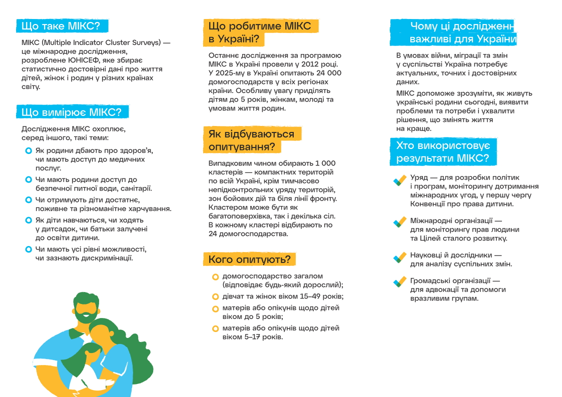 МІКС — це міжнародне вибіркове соціальне дослідження, що проводиться під егідою ЮНІСЕФ у понад 120 країнах. В Україні його реалізує Державна служба статистики України у співпраці з ЮНІСЕФ, Інститутом демографії НАН України та Громадською організацією «Український центр соціальних реформ», яка відповідає за організацію польових робіт.