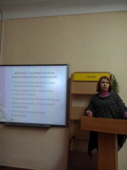 - впровадження інноваційних технологій як засіб розвитку творчої особистості. Доповідач - методист з профорієнтації Баула В.М., наголосила на створенні предметно-орієнтованих та навчально-інформаційних середовищ та технологій, які дозволяли б порівнювати особливості традиційної та інноваційної педагогіки в МНВК;