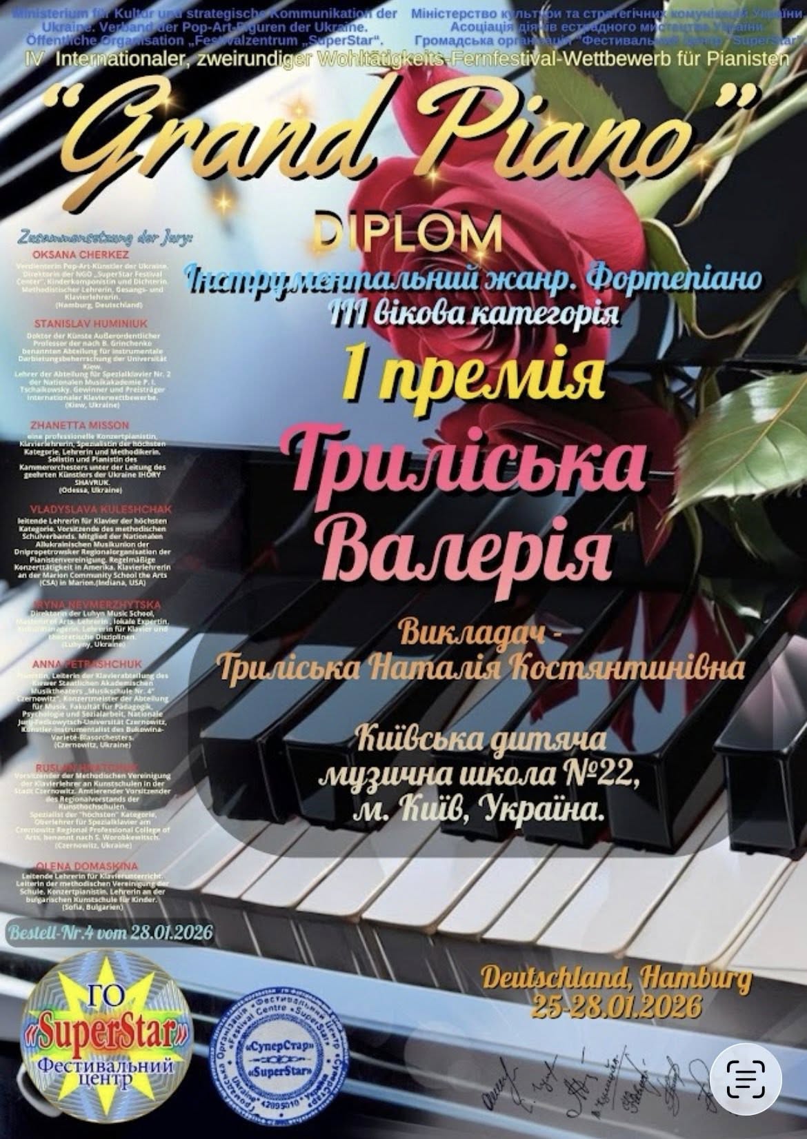 Днями учениця Київської дитячої музичної школи № 22 Триліська Валерія продемонструвала високий рівень виконавської культури, музичну зрілість та впевнене володіння інструментом на IV благодійному Міжнародному двотуровому фортепіанному фестивалі-конкурсі «GRAND PIANO!». Її виступ справив яскраве враження на членів міжнародного журі та був відзначений першою премією, що стало вагомим досягненням на міжнародному рівні.