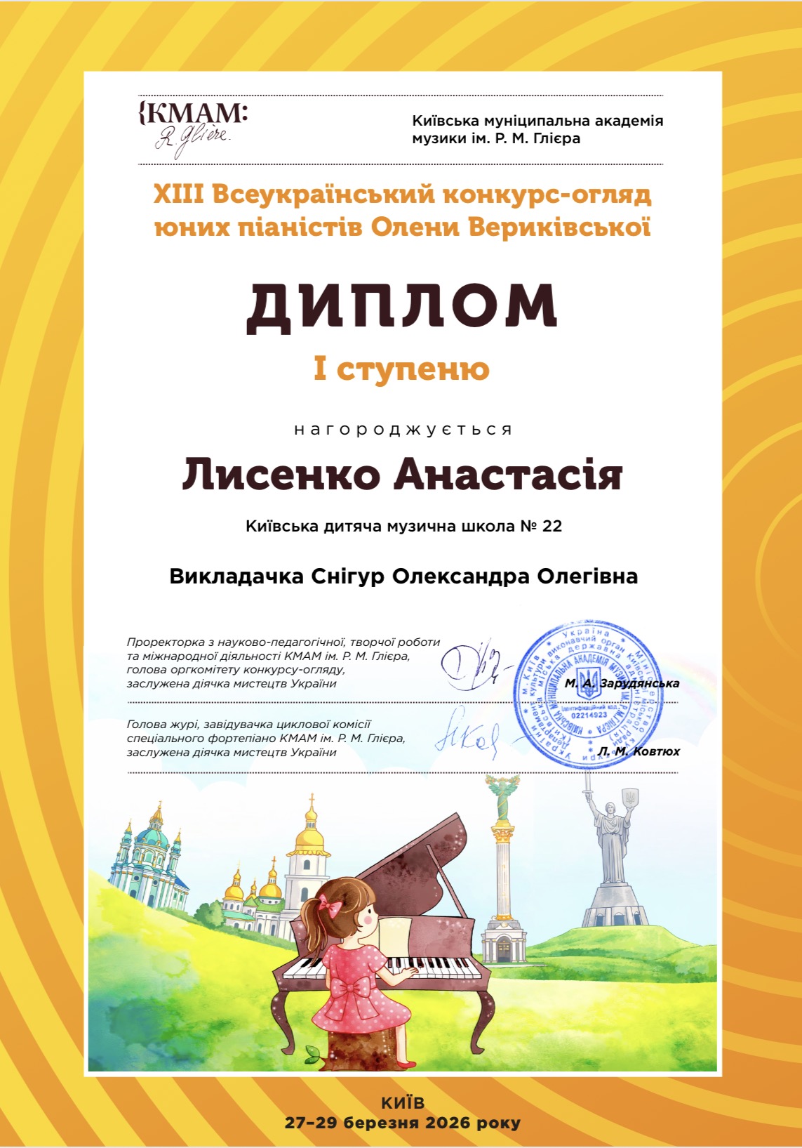 Учениця Київської дитячої музичної школи № 22, юна піаністка Лисенко Анастасія (викладачка Олександра Снігур) взяла участь у XIII Всеукраїнському конкурсі-огляді юних піаністів імені Олени Вериківської та виборола Диплом І ступеня.