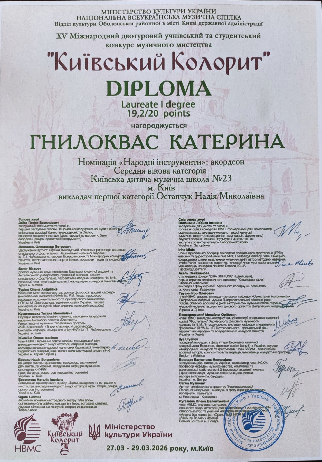 Учениця відділу народних інструментів класу акордеону Київської дитячої музичної школи № 23 Гнилоквас Катерина (викладач Надія Остапчук), стала переможницею ХV Міжнародного двотурового учнівського та студентського конкурсу музичного мистецтва «Київський колорит» у номінації «Народні інструменти» і здобула І премію в середній віковій категорії.