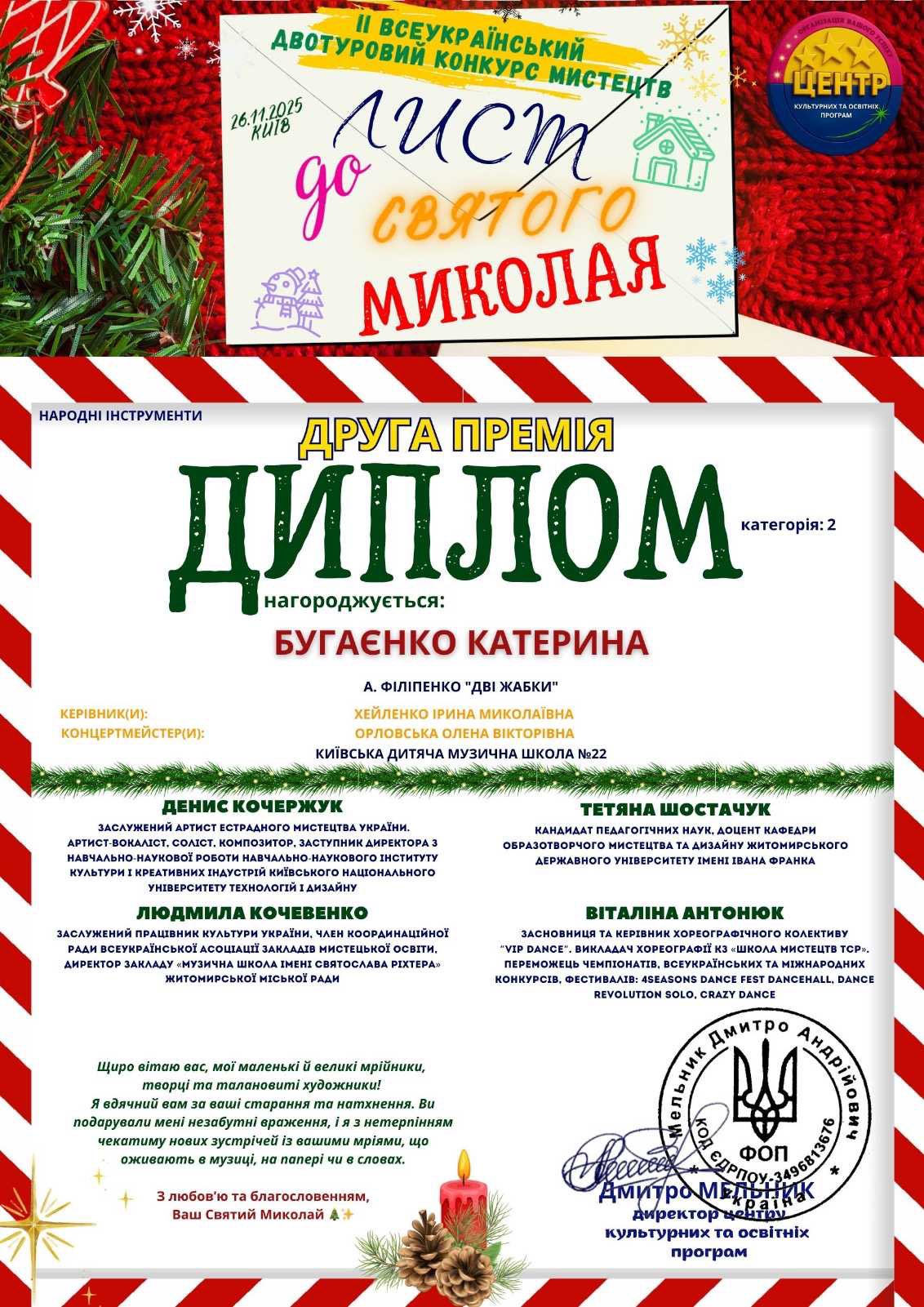 Київська дитяча музична школа № 22 вкотре підтверджує високий рівень підготовки та любов до української музичної традиції. Пишаємося учнями, радіємо їхнім досягненням і віримо, що це лише ще одна яскрава сторінка на шляху до великих творчих звершень. Нехай Святий Миколай і надалі надихає на нові перемоги, сміливі мрії та красиву музику!
