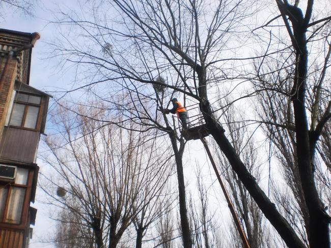 Перш за все, було виконано кронування, санітарну обрізку дерев, зняття сухостійних дерев та омели із застосуванням телескопічних вишок по вулицях: Горбачова, Чистяківській, на проспектах Перемоги та Корольова, в скверах на вулиці Котельникова, 26-32 та Депутатській, 13-17.