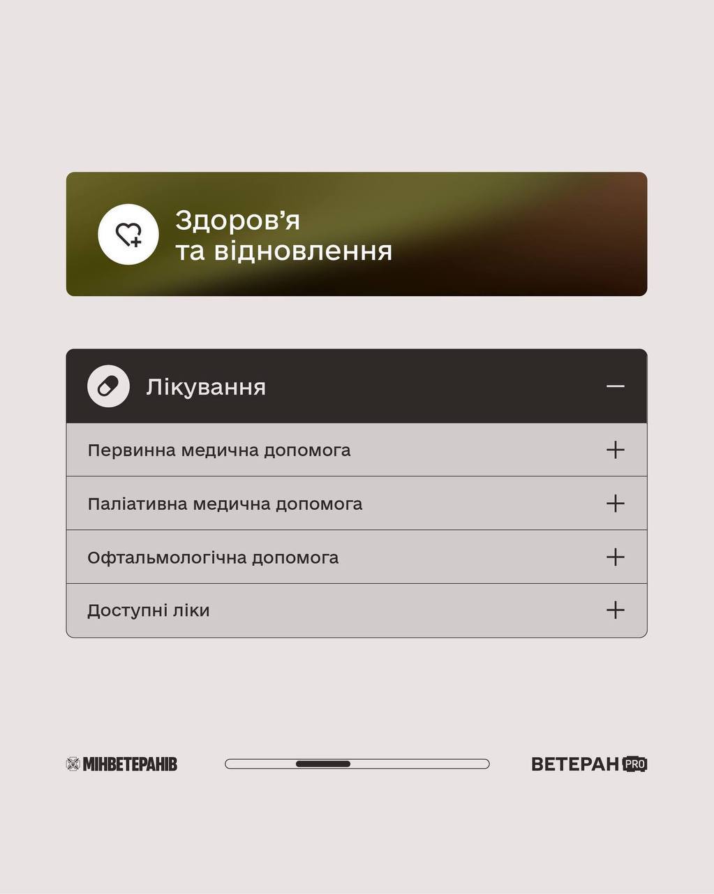 Держава забезпечує системну підтримку ветеранів і ветеранок, надаючи комплекс послуг для лікування, реабілітації та відновлення якості життя. Зокрема, доступні такі напрями допомоги: