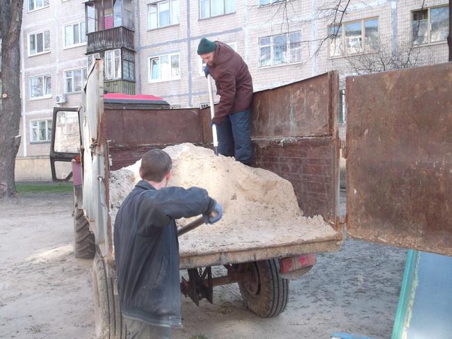 Робітники КПУБ завезли пісок на дитячий ігровий майданчик на вулиці Кулібіна, 4/2.