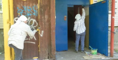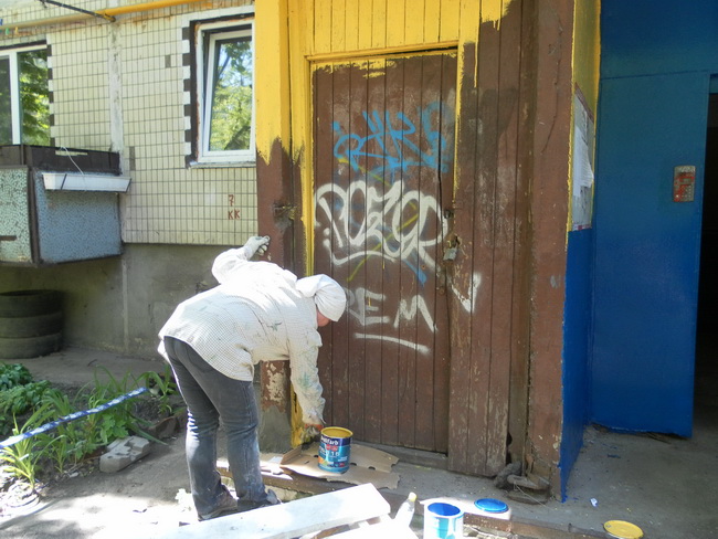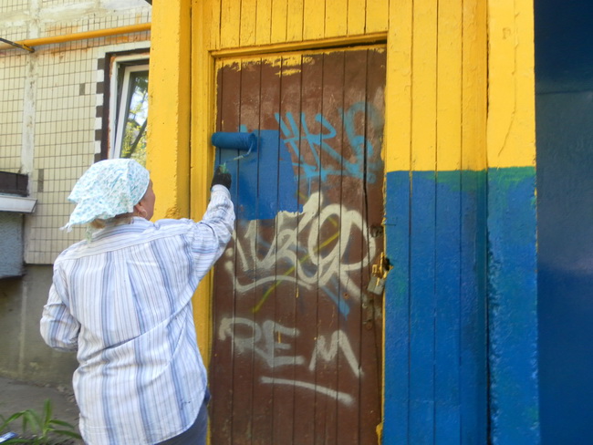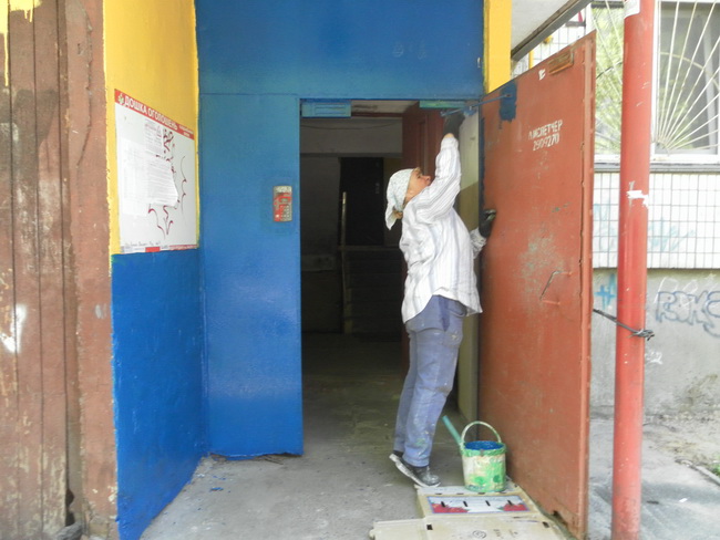 Працівники «ЖЕД – 4» та КП «Керуючої компанії з обслуговування житлового фонду Святошинського району міста Києва», під керівництвом майстра ремонтної дільниці - Цесаренко Світлани Михайлівни, було проведено фарбування вхідної групи 4 під’їзду житлового будинку № 13-б по бульвару Ромена Роллана. Фарбування вхідної групи було пофарбовано в жовто-блакитний колір.