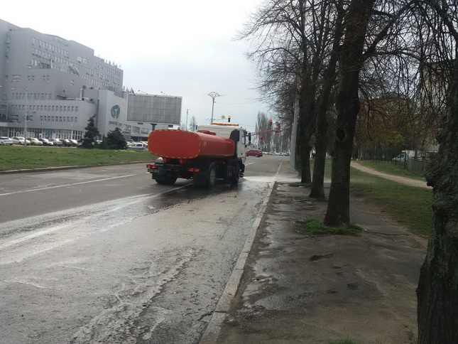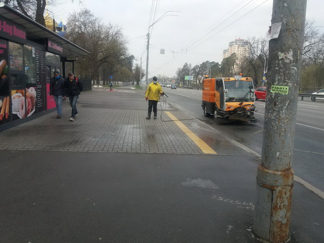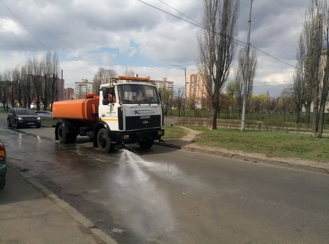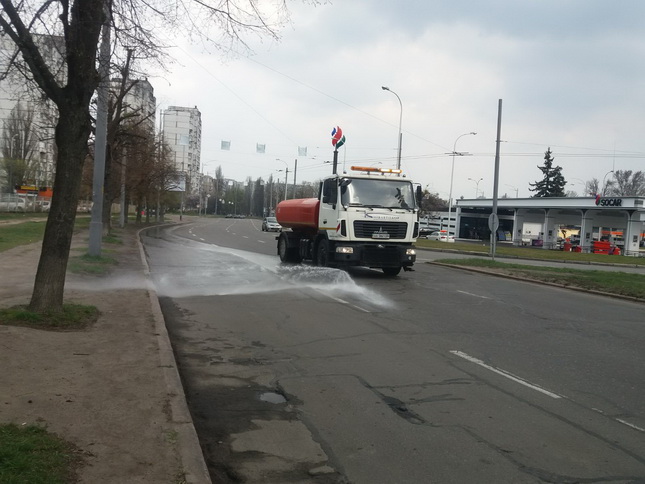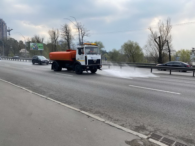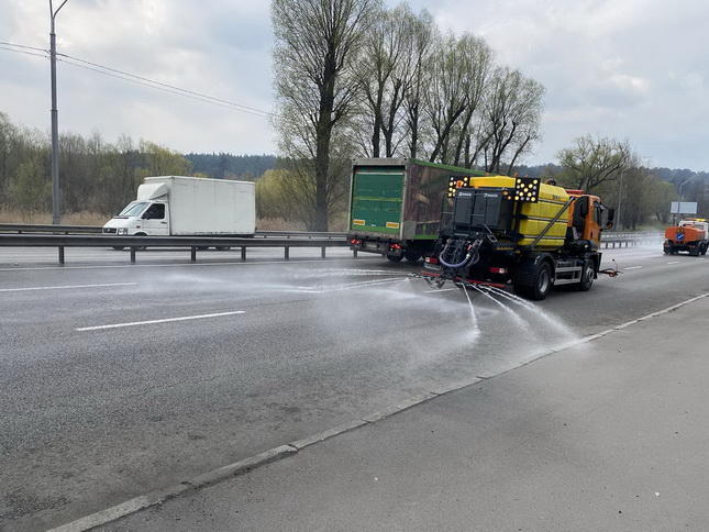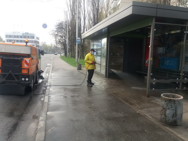 Працівники комунального підприємства «Шляхово-експлуатаційне управління по ремонту та утриманню автомобільних шляхів та споруд на них Святошинського району» продовжують миття доріг i зупинок громадського транспорту (фото)