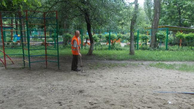 Двірники технічної дільниці № 2 згідно графіка проводять вологе прибирання сходових клітин житлового будинку №28 на вулиці Булаховського та територію дитячого майданчика на вулиці Булаховського, 34-а.